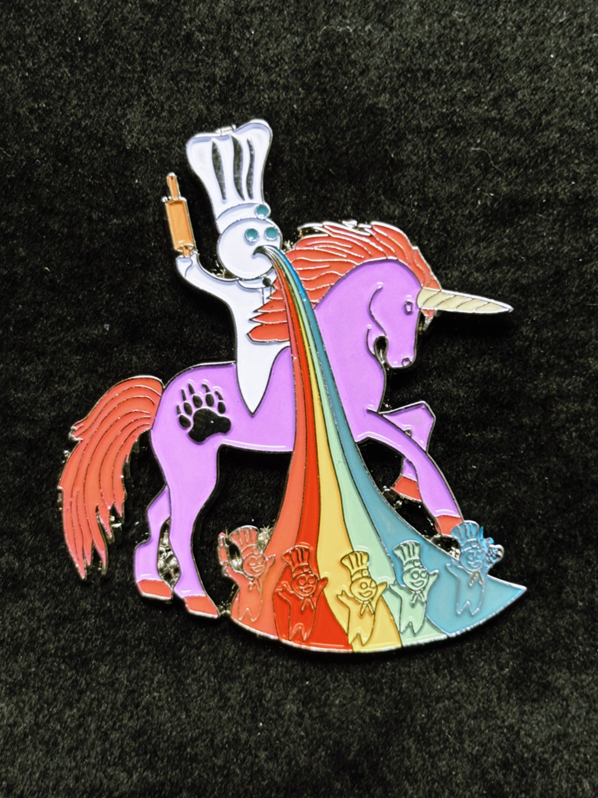This bold 2” x 1.75” hard-enamel pin features a chaotic, colorful fantasy mashup: a chubby chef figure riding a purple unicorn and unleashing a full rainbow cascade. Finished with vivid enamel fills and polished metal lines, this pin stands out instantly on jackets, bags, hats, and pin boards. A perfect piece for collectors who love weird, bright, and unapologetically wild designs.